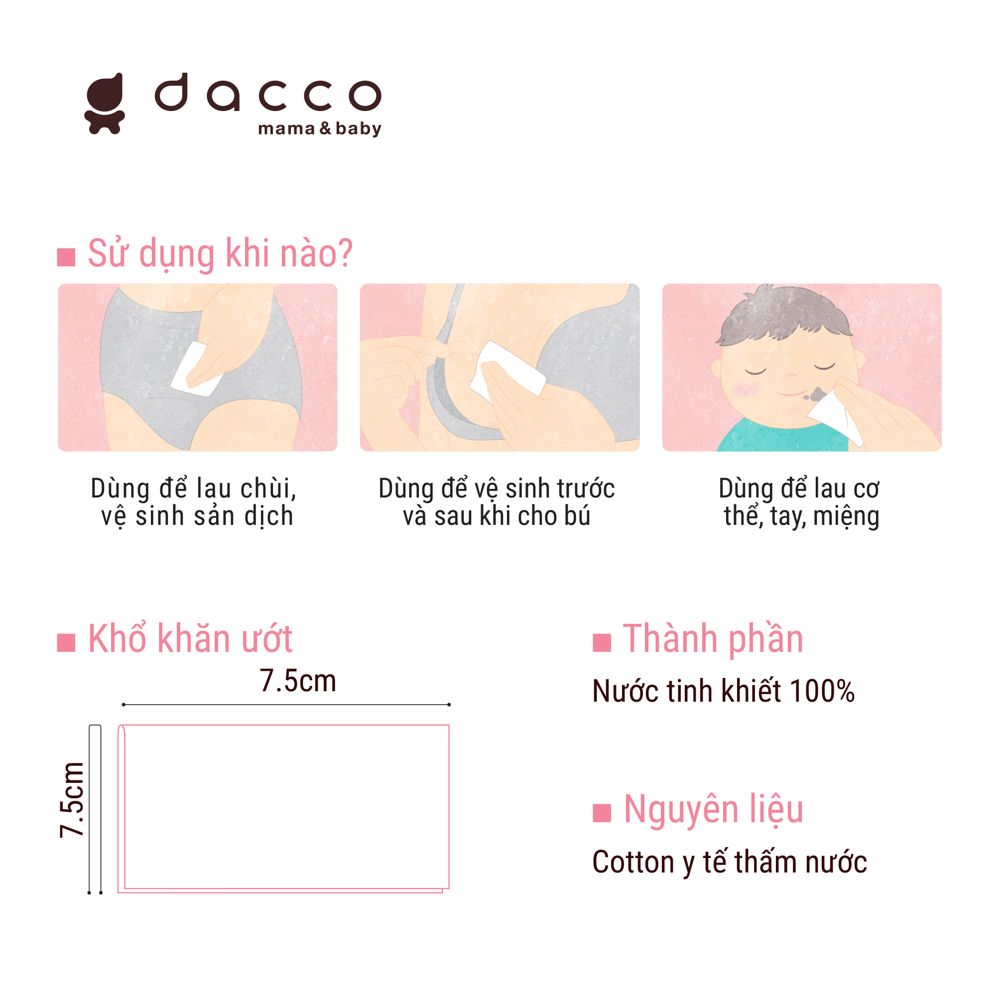 Sản phẩm được sử dụng để vệ sinh bầu ngực; lau chùi sản dịch; vệ sinh tay, vùng miệng, vùng mặt cho trẻ sơ sinh và người lớn. Sản phẩm được tiệt trùng và được tẩm ẩm với nước tinh khiết 100%, đảm bảo sự vô khuẩn và vệ sinh khi sử dụng.
